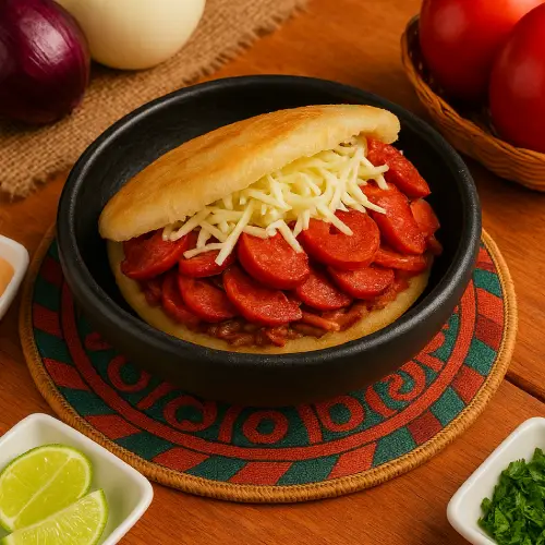 Arepa rellena con 80 Gramos de chorizo 100% de cerdo 🐖 cortado en julianas acompañado con queso 🧀