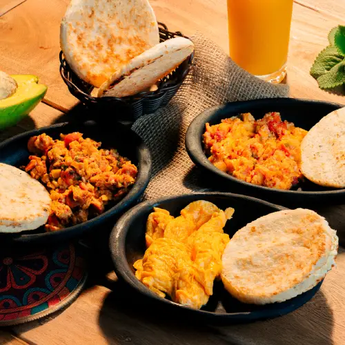 Arepa rellena con huevos revueltos acompañado y queso 🧀